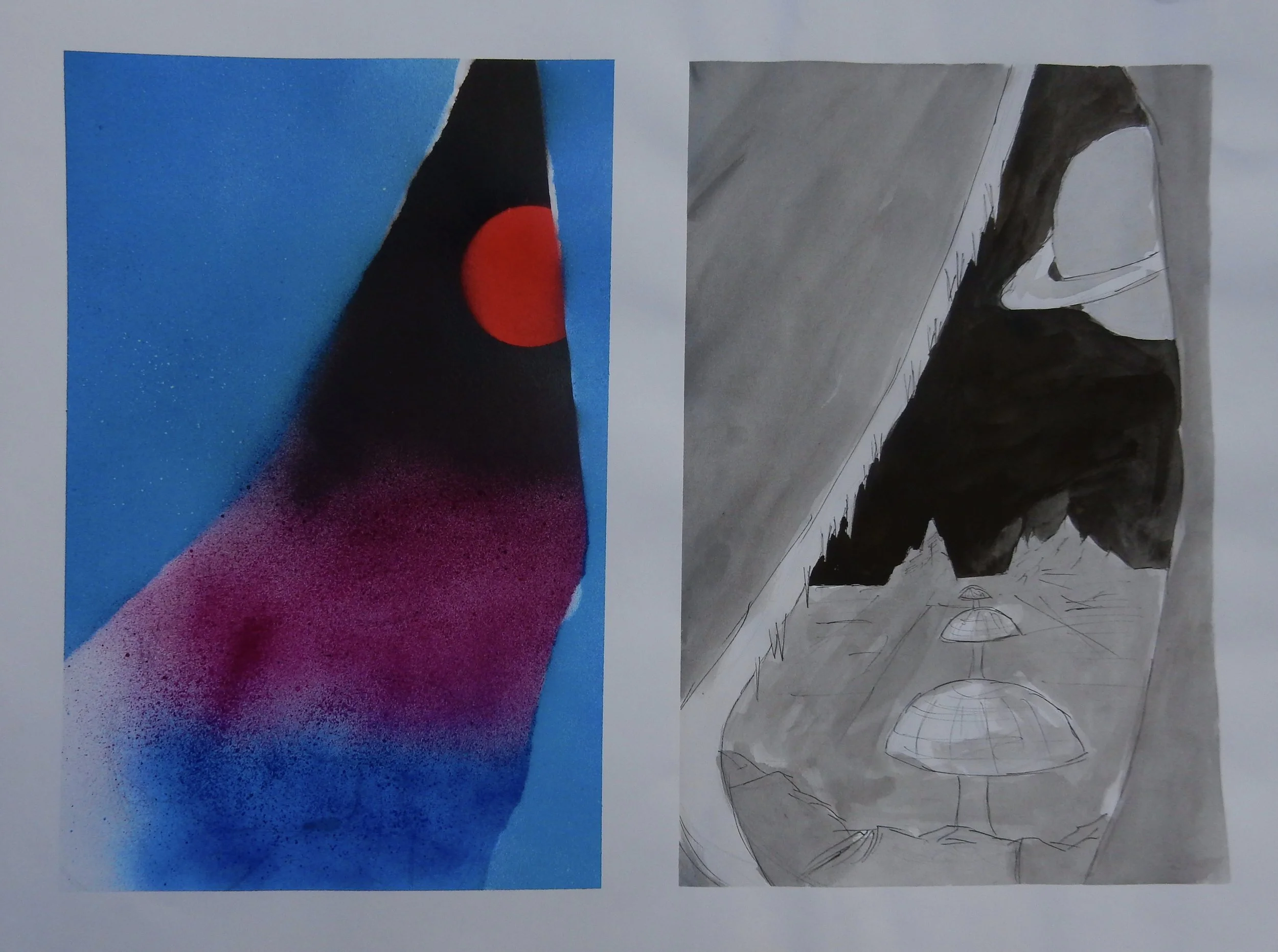 Once I chose to use the cave as a frame, I had a few ideas for the landscape beyond. My first thoughts included a space landscape and a planet. This evolved into an idea behind the piece: a retro-futuristic landscape that shows the build up of a civilization. Bio-domes from 50's sci-fi ad's and illustrations from science magazines from the time are the main source of inspiration for this piece. The optimistic view of the travel of tomorrow interested me, and the idea behind colonization is one of my favorite topics. I have been a long time follower of Elon Musk and SpaceX, and the landings of the Falcon 9 Stage One booster in December 2015, and these happenings greatly impacted this idea.