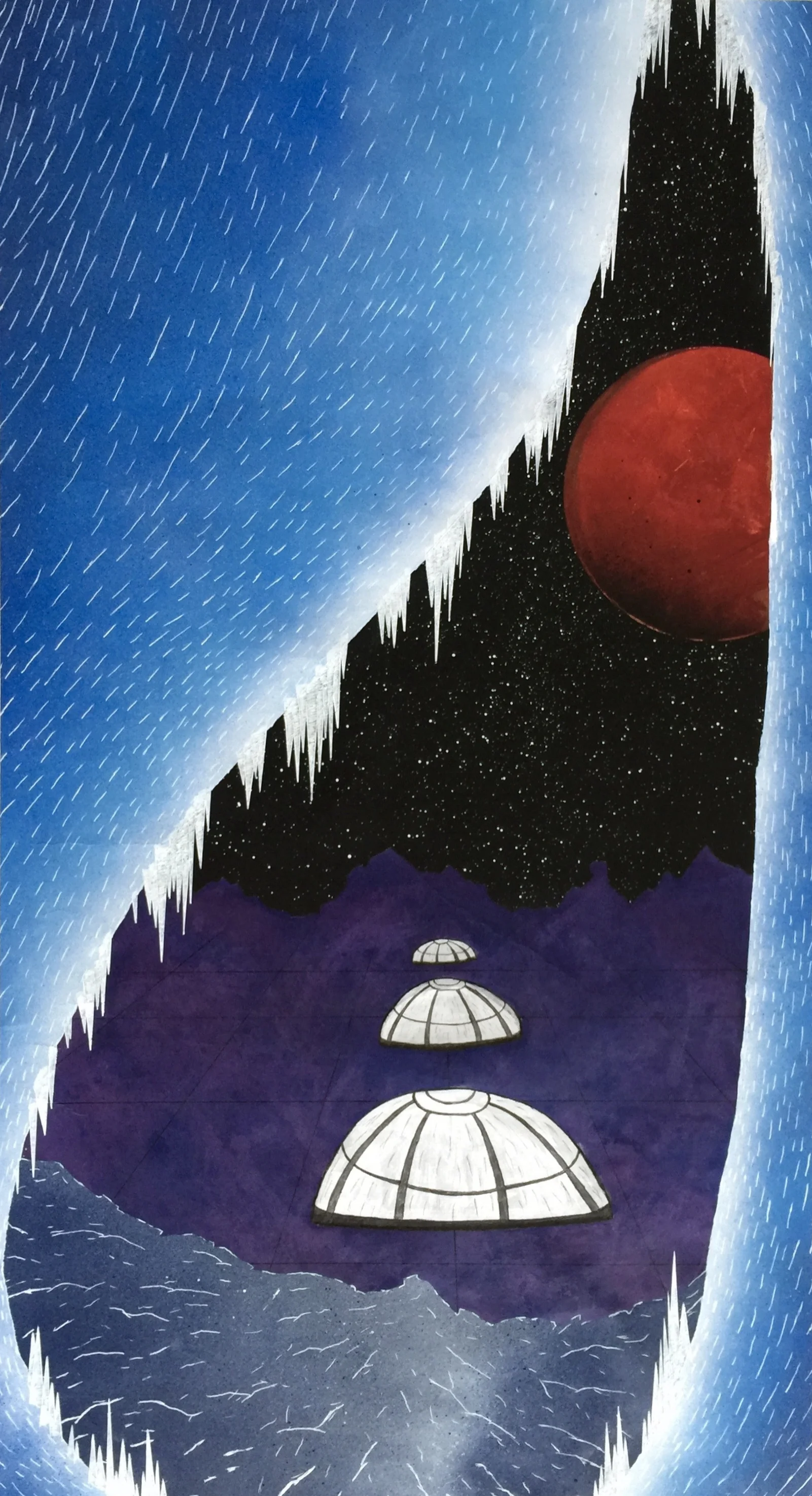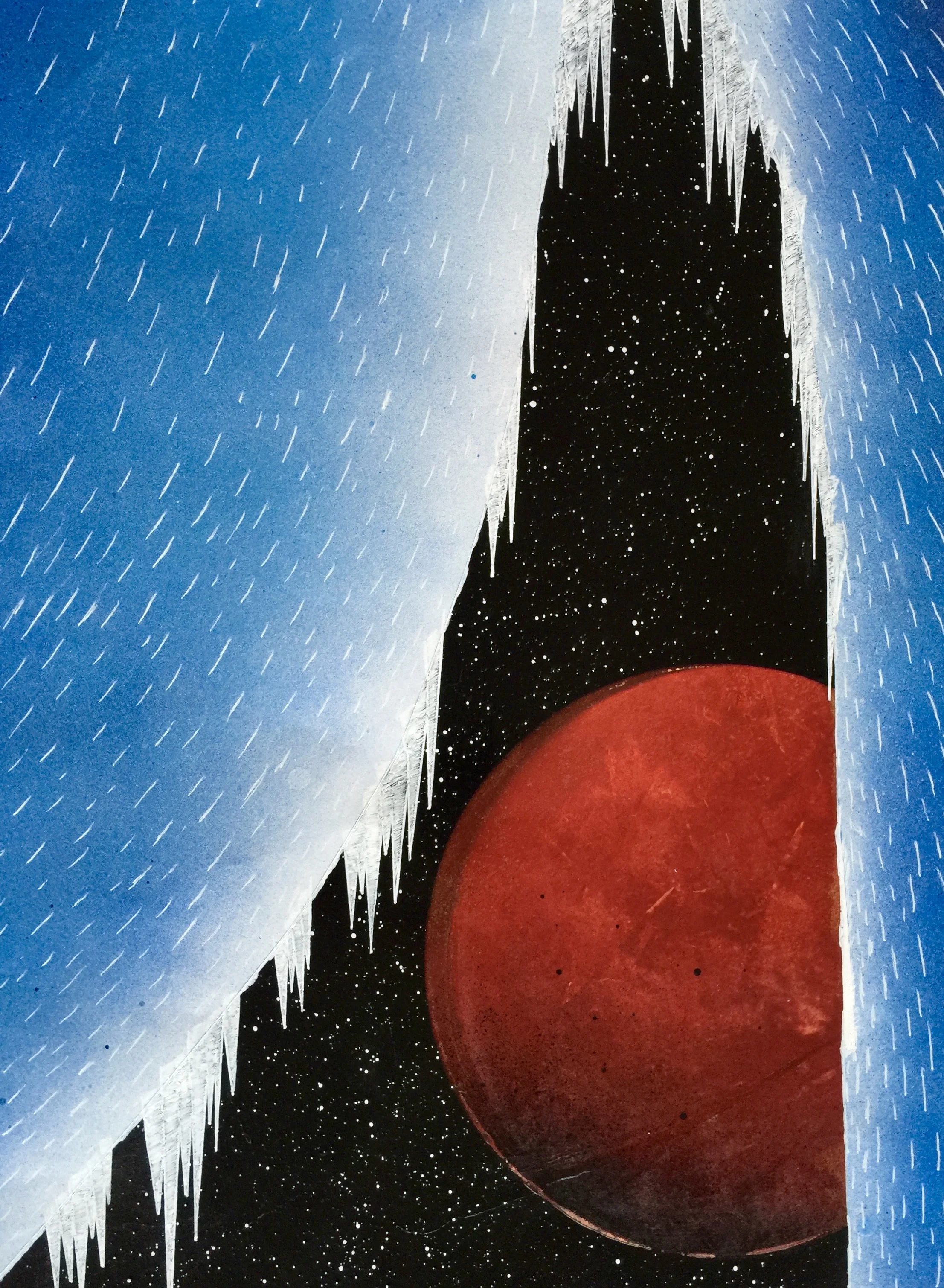 This work includes inspiration from my earliest attempts at using spray paint as a medium, in which I created views of space and planets with techniques learned online. I had worked on and off with spray paint since those experimentations, but never seriously. When I began work on these assignments, my first thought was to use spray paint due to the size of the pieces, so using these techniques made this piece complete in the way that I wanted. Taping off sections to create the sense of layered distances was a large part of the process, as well as drawing the icicles in with the white paint pen.